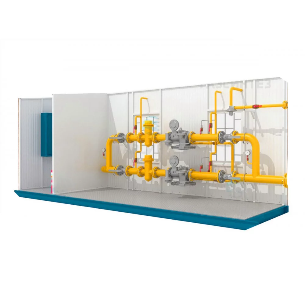 Пункт газорегуляторный блочный МРПБ-1000 — это комплекс технологического оборудования и устройств, смонтированного в транспортабельном боксекаркасно-модульного типа.Пункт газорегуляторный блочный МРПБ-1000 с регуляторами РДГ-50Н(В) предназначен для понижения входного давления газа в диапазоне от 0,05 до 1,2 МПа до выходного в диапазоне 1-600 кПа., и удержания его на заданном уровне вне зависимости от колебания входного давления и величины расхода газа.Спецификация МРПБ 1000 1-кран шаровой для манометра DN15 (11Б41п21)-2шт; 2-предохранительный сбросной клапан ПСК-25-1шт; 3-кран шаровой КШ-20-4шт; 4-кран шаровой КШ-50-4шт; 5-фильтр газовый ФГ с ИПД-2шт; 6-регулятор давления газа типа РДГ-50Н(В)-2шт; 7-кран шаровой КШ-15-2шт; 8-манометр-1шт; 9-напоромер (манометр)-1шт; 10-кран шаровой КШ-25-3шт.