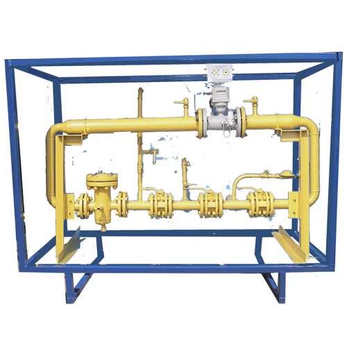 Устройство и принцип работы узлов учета газа УУРГУзлы учета расхода газа УУРГ представляют собой рамную сварную конструкцию имеющую строповочные устройства (места строповки), рассчитанные на подъем и погрузку.Узлы учета УУРГ состоят из входной и выходной запорной арматуры, фильтра для очистки газа (оборудованного манометром для измерения перепада давления), измерительного трубопровода со счетчиком расхода газа или суживающим устройством. Для работы узла учета во время обслуживания или замены фильтра, счетчика или суживающего устройства предусмотрен байпас. В случае комплектации узла учета электронным корректором расхода газа в измерительный трубопровод врезаются соответствующие датчики (давления, температуры).Схема УУРГ-100