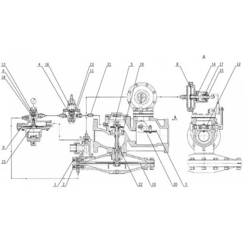 Состав основного комплекта Наименование детали номер позиции Мембрана механизма контроля 8 Мембрана пилота 9 Мембрана рабочая 10 Мембрана стабилизатора 11 Пружина клапана отсечного 12 Пружина клапана пилота 13 Пружина механизма контроля большая 14 Пружина пилота 15 Пружина стабилизатора 16 Пружина механизма контроля малая 17 Перечень дополнительных деталей Наименование детали Номер позиции Дроссель надмембранный 1 Дроссель подмембранный 2 Клапан отсечной 3 Клапан пилота 4 Клапан рабочий 5 Клапан стабилизатора 6 Седло пилота 18 Седло регулятора 98 мм 19 Уплотнитель клапана отсечного 20 Фильтр регулятора 21 Шток клапана рабочего 22 Шток механизма контроля 23